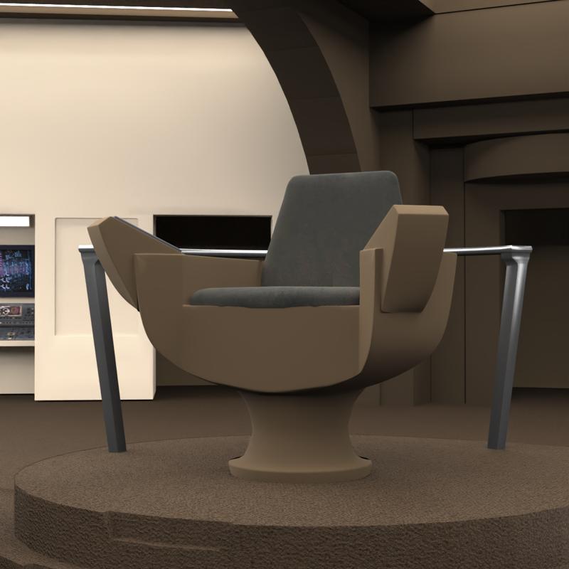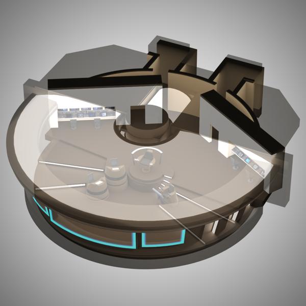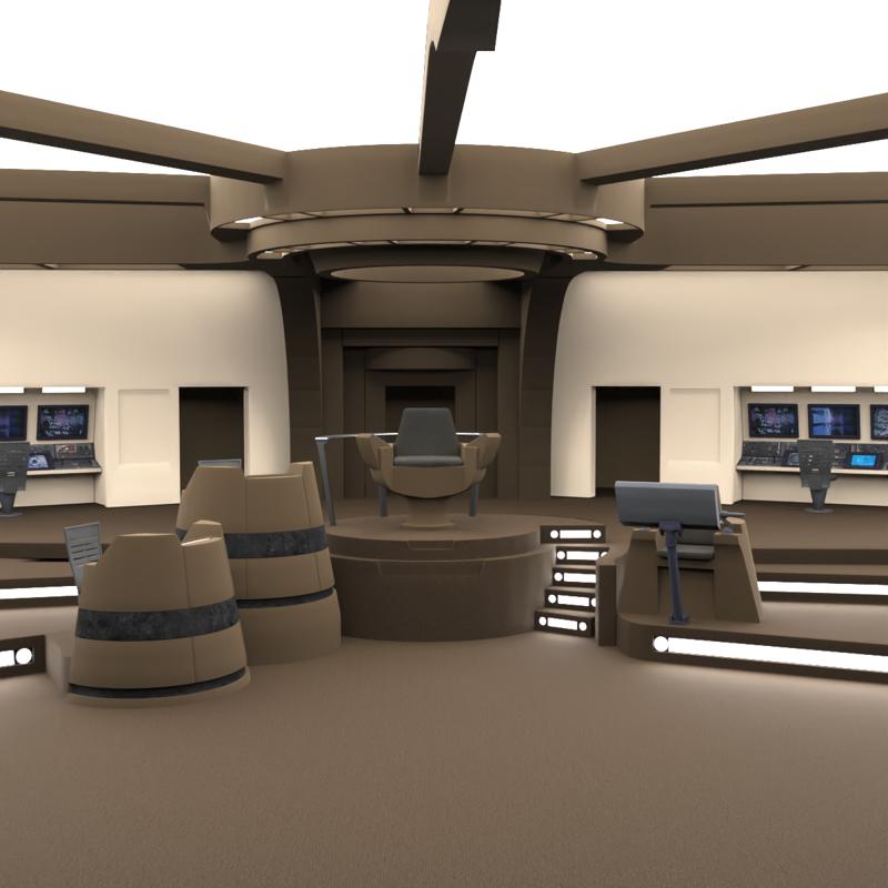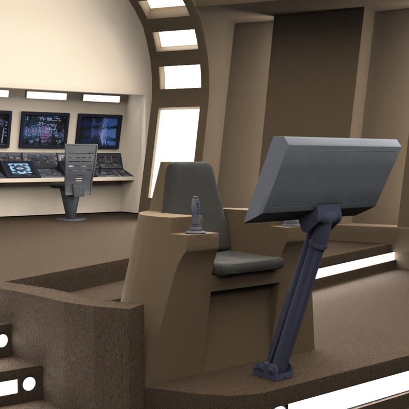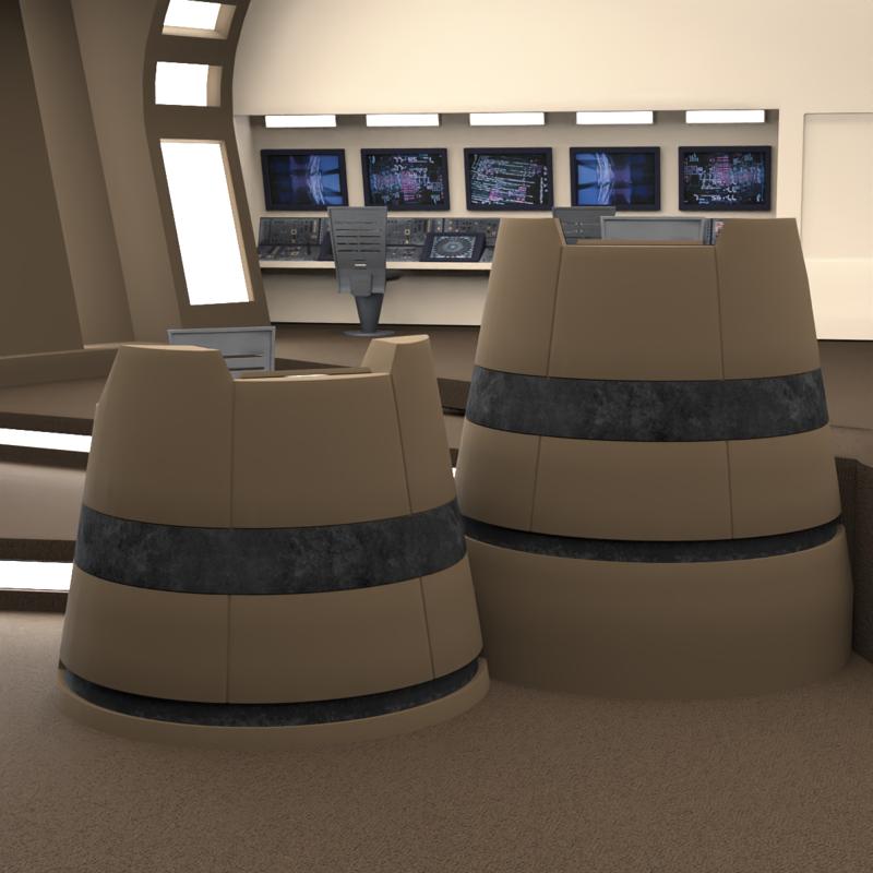 This bridge layout was designed for exploratory vessels. There are three seated positions to the left and right of the commander chair: helm, comms station, and science station. Additional stations at the rear of the bridge can be configured to monitor ship functions or exterior sensor readings.