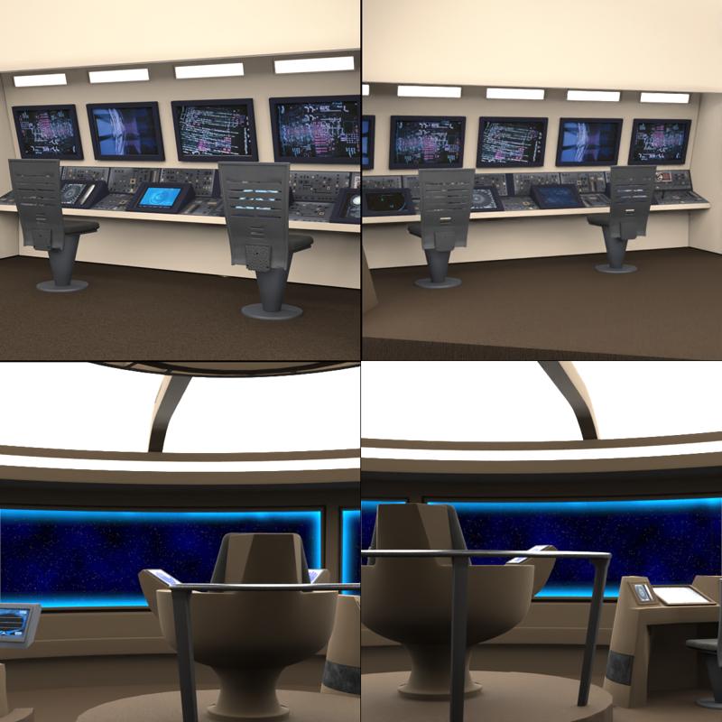 .: Bridge Features :. • Commander chair can rotate, with a Pose Control on the Body. • Helm screen can move front-to-back, with a Pose Control on the Body. • Helm joystick can move front-to-back and side-to-side. • Helm throttle can move front-to-back. • Two joysticks on the left rear wall can move front-to-back and side-to-side. • Two joysticks on the right rear wall can move front-to-back and side-to-side. • Six station chairs can be hidden/ shown and repositioned positioned in the scene. • All of the walls can be hidden or shown to suit the needs of your scene. • This bridge set has corridors in the rear for the crew to enter and exit, so there are no doors • Loading the bridge will also load all of the station chairs in the correct location.