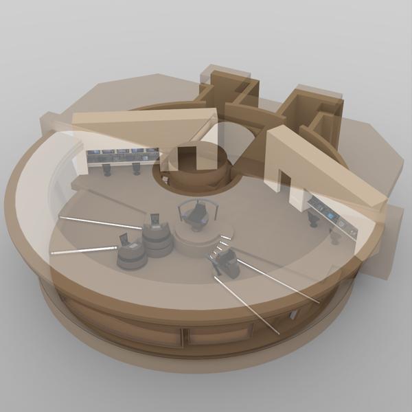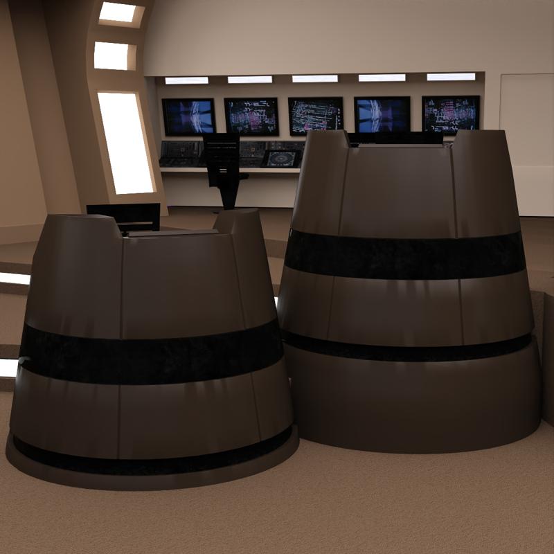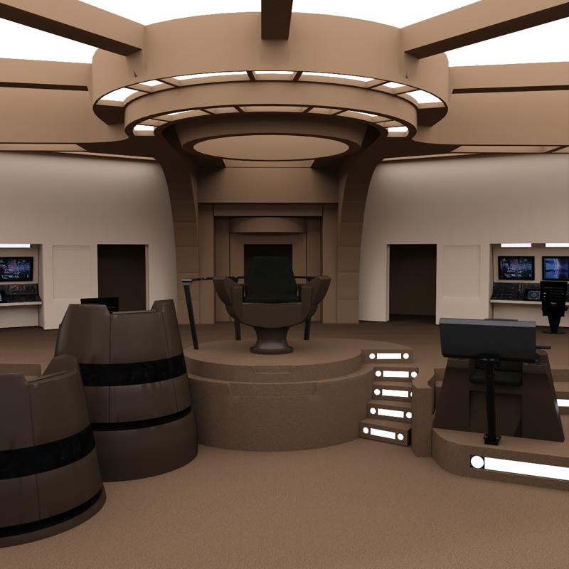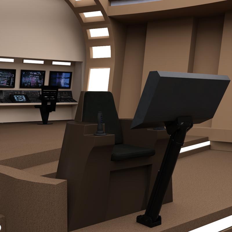 This bridge layout was designed for exploratory vessels. There are three seated positions to the left and right of the commander chair: helm, comms station, and science station. Additional stations at the rear of the bridge can be configured to monitor ship functions or exterior sensor readings.