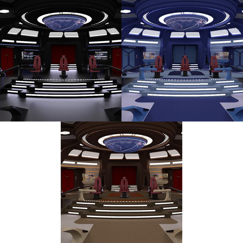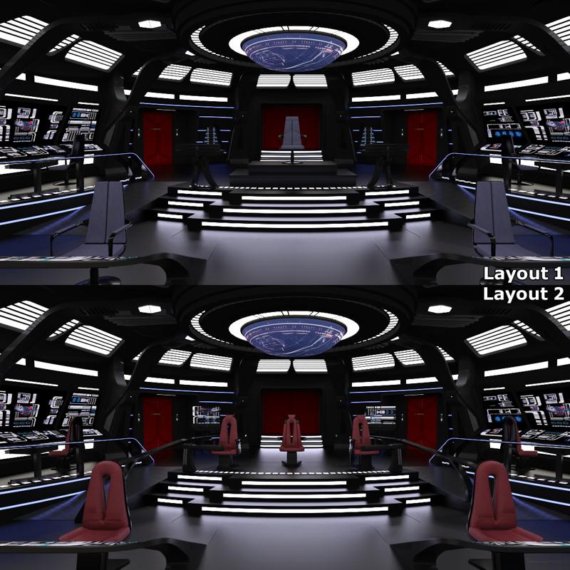 .: Hide/ Show Presets :. • Includes 2 presets to change the layout of the bridge: - Odyssey: raised platform under the captain`s chair, basic seats, no extra workstations, and no railing - Titan: no raised platform, more comfortable chairs, extra workstations, and a railing around the center of the bridge