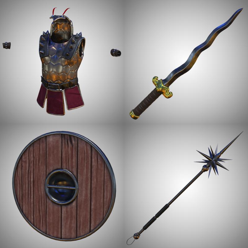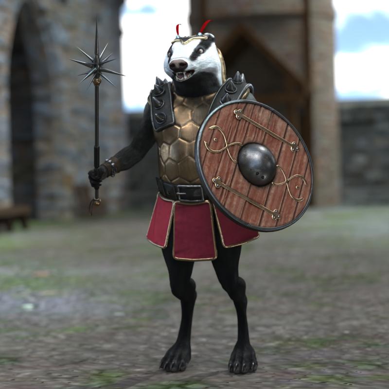 .: Product Features :. • Includes the following Poser figures (obj, cr2/ png) and props (obj, pp2/ png): - Badder, at 47,408 polygons. - Armour, at 79,830 polygons. - Dagger, at 4,798 polygons. - Spiked Mace, at 13,686 polygons. - Shield, at 33,184 polygons. • Inverse Kinematic (IK) chains are included for the arms and legs.