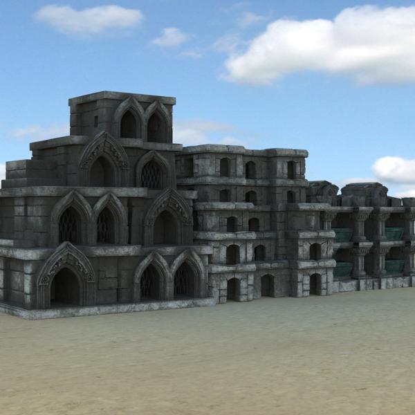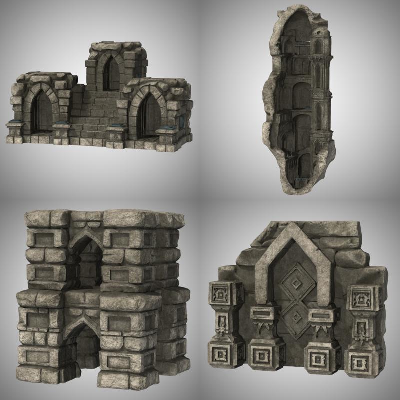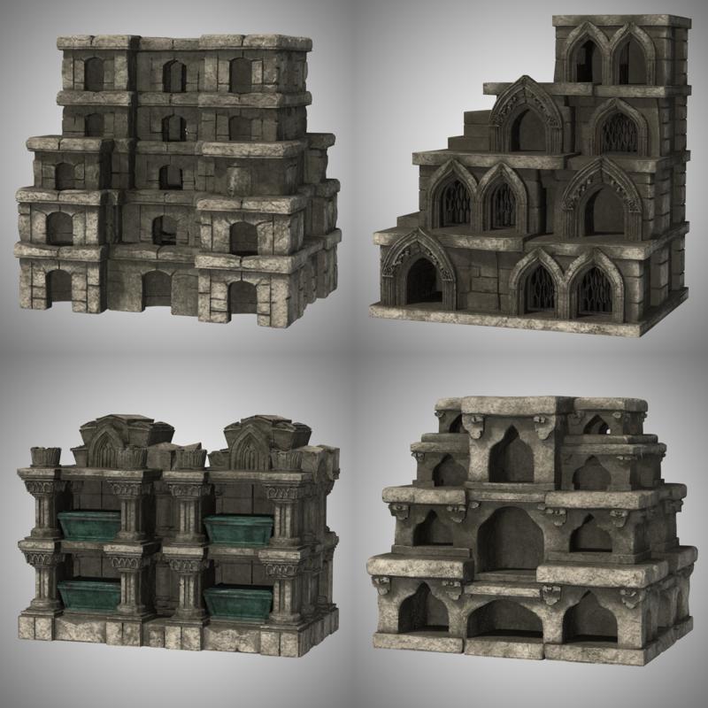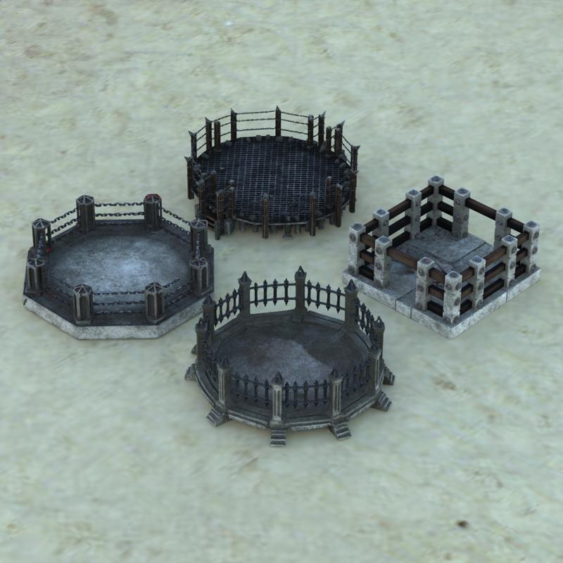 Set 1 in the Dungeon Pack collection: 4 arenas, 5 crypts, 2 dungeons, and 1 wall. Each model comes with multiple materials to change the look.